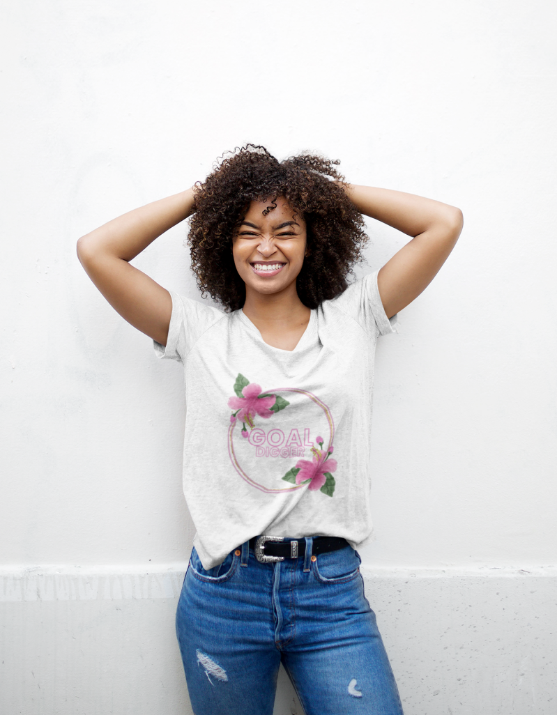 This exquisite tee showcases a unique gold ring adorned with delicate pink and white lilies, creating a beautifully abstract design. The phrase "Goal Digger" is gracefully intertwined with the design, symbolizing your determination to chase your dreams with grace and style.