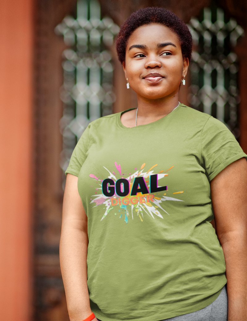 This eye-catching tee boasts a unique pop art-inspired design featuring the iconic words "Goal Digger." It's a vibrant and dynamic statement that celebrates ambition in a bold and stylish way.